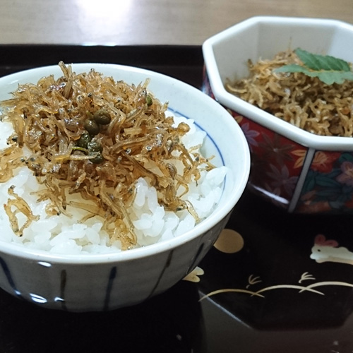 上干ちりめんをさんしょだれで煮詰めた「ちりめん山椒」