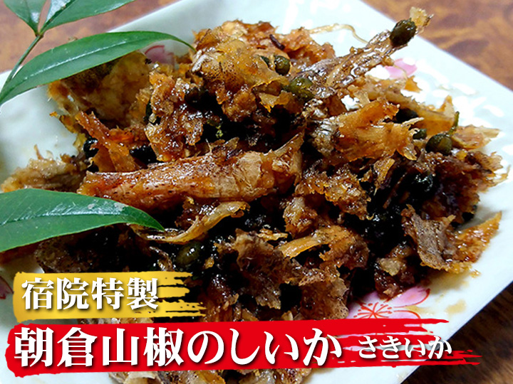 日本海産の「スルメイカ」・養父市特産の「朝倉山椒」・地元中野醸造「百年蔵の醤油」